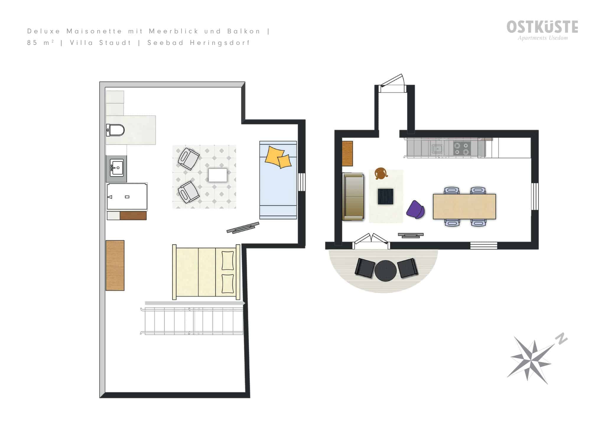 Das geräumige Maisonette-Apartment im Dachgeschoss hat eine Größe von 85 Quadratmeter und bietet Platz für bis zu 4 Personen. Der seitlich gelegene Balkon bietet Ihnen einen wundervollen Blick auf die Ostsee. Auf der unteren Etage befinden sich die voll ausgestattete Küche, der gemütliche Wohnbereich mit Essplatz und eine Schlafcouch. Eine Treppe führt nach oben in einen offenen Schlafbereich mit großzügigem Doppelbett und einem zusätzlichen romantischen »Nachtlager« unter dem historischen Rundfenster mit spektakulärem Blick auf die Ostsee. Ebenfalls auf der oberen Etage liegt das Bad, bestehend aus maßgefertigten Design-Cubes, die geschickt in den Raum integriert sind. Das Maisonette-Apartment ist mit einer Klimaanlage ausgestattet und das Doppelbett hat eine Größe von 180×200 cm.